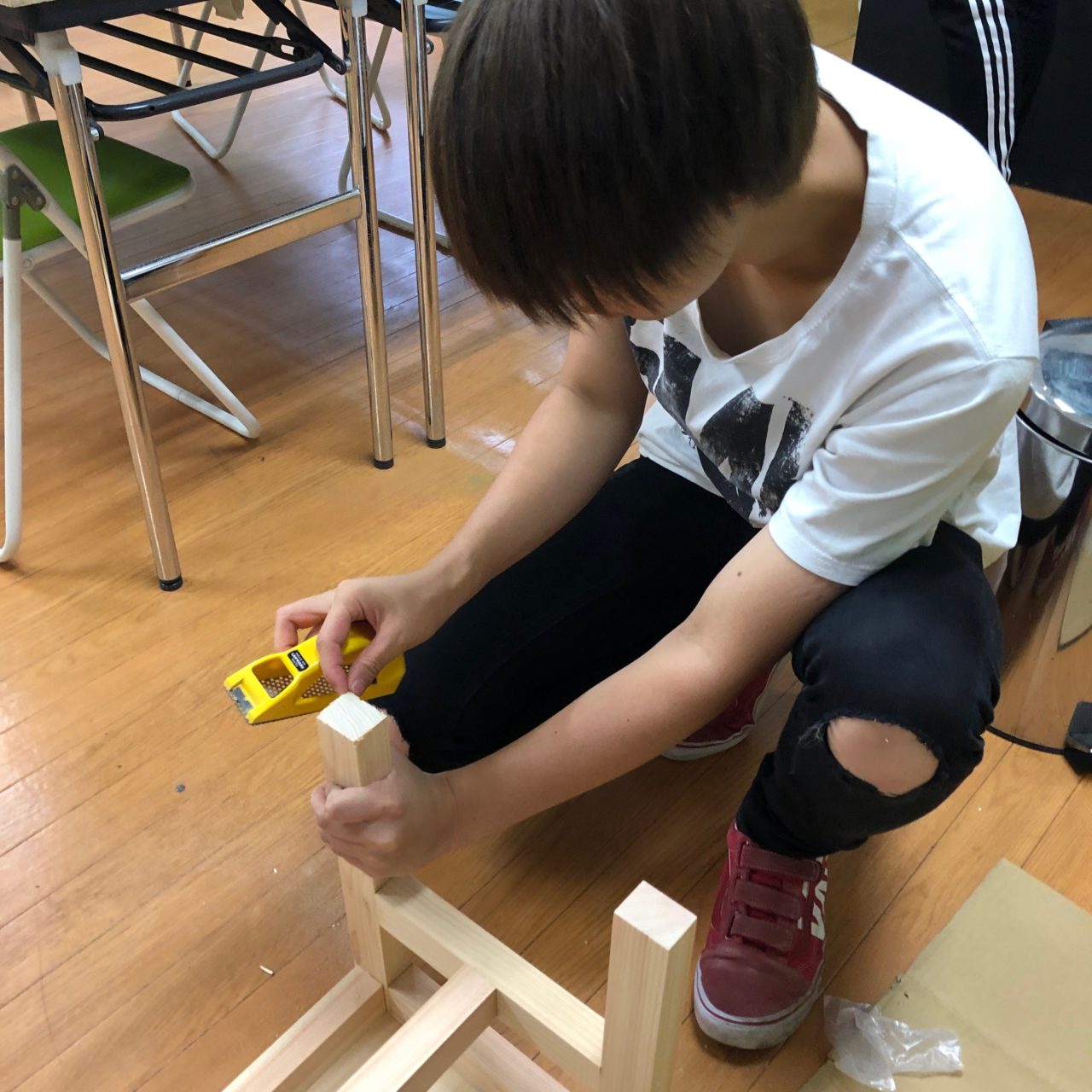 次に木の椅子を用意。椅子の角の方などをヤスリで若干丸く調整し、カラーを塗っていきます。